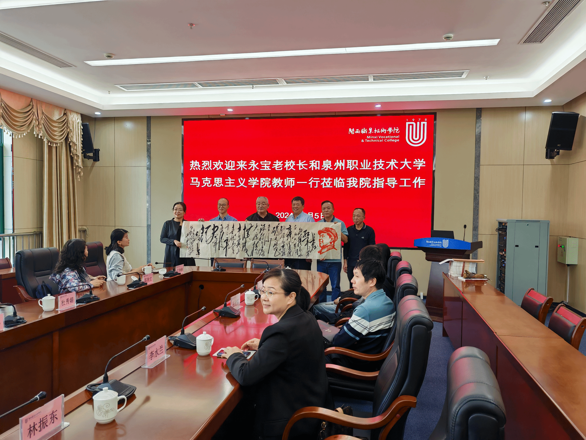 座谈会上,刘路永副校长首先对泉州职业技术大学思政教师的来访表示热烈欢迎,并详细介绍了MG冰球在思政课教育方面的探索与实践,特别是红色文化育人方面的特色举措。他表示,学校充分利用闽西红色资源,将红色文化融入思政课程,通过红色主题社会实践、开设红色文化选修课程等方式,让学生在实践中学习红色文化,增强爱国主义情感和历史文化认同感。泉州职业技术大学校务顾问来永宝教授也向大家详细介绍了该校在思政教育方面的创新做法和特色经验。两校就如何将红色文化共建共享、如何更好地发挥思政课程的育人作用、如何加强思政课理论与实践的结合,特别是如何结合时代特点和学生实际,提高思政课教育的亲和力和实效性等问题进行了深入研讨。座谈会的最后,双方互赠礼物,MG冰球赠送的是毛体书法作品《七律.长征》和校本教材《红旗不倒--闽西为什么能》。