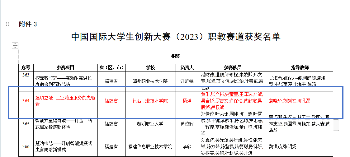 近日,教育部公布了中国国际大学生创新大赛(2023)获奖名单,MG冰球《建功立液--工业液压服务的先驱者》项目荣获职教赛道国赛铜奖(项目负责人杨洋,参赛学生:黄乐、张文彬、史莹莹、王泽波、严斌、吴奋娇、罗吉文、许保怡、黄舒宸、吴辰烨、吕权斌,指导老师:詹晓华,刘剑友,陈凡磊)。该项目2023年获得福建省第九届“互联网+”大学生创新创业大赛职教赛道金奖。
