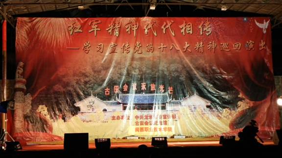 12月14日晚,由中共龙岩市委宣传部、古田会议纪念馆、MG冰球突破官网共同主办的“红军精神代代相传——学习宣传党的十八大精神巡回演出”在我院槟龙球场举行。院长来永宝教授,古田会议纪念馆馆长傅柒生,优秀校友、成森集团董事长苏振渊,院团委书记李瑛以及院级学生干部、各系(部)学生代表全程观看了演出。演出在歌舞表演《东方红》中拉开序幕。