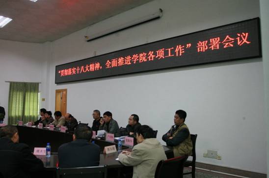 来永宝院长就如何贯彻落实党的、团的、团、中共、中国工会十八大精神,全面推进学院各项工作作了重要部署讲话。他把学院当前主要任务归纳成“十大项十小项”:一是深入学习宣传党的、团的、团、中共、中国工会十八大精神。把学习、宣传、贯彻和落实党的、团的、团、中共、中国工会十八大精神作为当前和今后一段时期首要的政治任务,务必做到三个结合,收到三个实效,用党的十八大精神武装头脑、指导实践、推动工作,迅速在全校掀起学习宣贯彻落实党的十八大精神热潮。二是扎实推进国家骨干校建设工作,要求各职能组、项目组进一步发挥作用,在修改建设方案和任务书的同时,实施骨干校建设节点验收与奖励工作,在今年底前完成相关规章制度的集结成册,力争明年2月底前的建设任务顺利完成。三是做好中国革命老区职业教育联盟的筹备工作,包括联盟章程、成立大会的方案等撰写工作,争取明年4月初在我院举办成立大会。四是加大校企合作力度,利用原有的基础和特色,加快与开发区、三个新区的交流合作,努力建设好校中厂,开展生产性实习基地,鼓励教师在校内办公司,加快现代学徒制建设步伐。五是争取明年招生工作取得新突破,要求尽快制定招生工作方案,创新宣传模式,形成人人参与、天天宣传的良好氛围。六是加快重点项目建设,要求启动校园总体规划的编制工作,年底前做好卫培楼的鉴定与使用工作,力争在明年3月底前教学实训大楼完成地面六层、学术交流中心地面五层的建设任务。七是完善防护体系,明确校园安全不能通过物业公司以包代管,相关职能部门要进一步采取有效措施,强化管理,坚决遏制校内盗窃案件再次发生,切实维护校园的安全和稳定。八是进一步加强科研工作,做到科研工作与教学工作、实训工作相辅相成,努力争取科技局、社科联等相关部门的支持,力争多出成果,推动科研工作更上一个新台阶。九是加强师资队伍建设,要实施校内第二轮教学名师评选和实施优秀青年教师评选工作,促进青年教师脱颖而出,要在名师工作室建设方面取得突破。一是抓好常规教学工作,如省级教改、专业服务产业能力提升等,要求认真做好期末复习迎考,严格学生期末考试监考、巡考纪律。此外,来永宝就东留乡联乡挂村帮户、毕业生就业、专业建设、人大代表政协委员撰写方案、向老干部统战对象通报办学情况、修订党风廉政建设责任制、举办元旦文体活动、寒假学生社会实践、期末与寒假安全保卫、客座教授迎新座谈等10项工作也进行了具体布置。