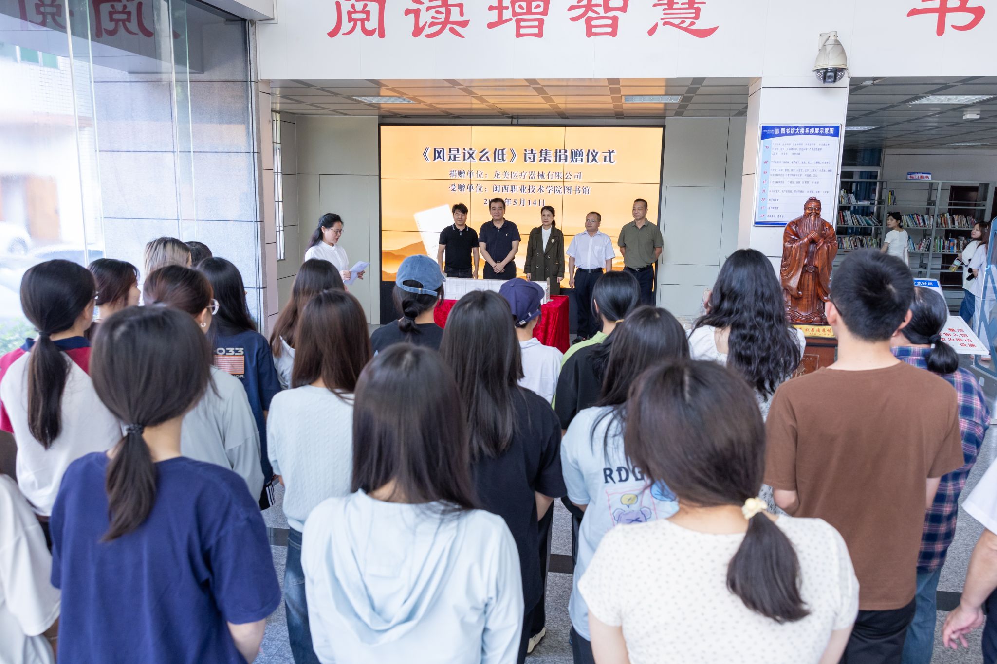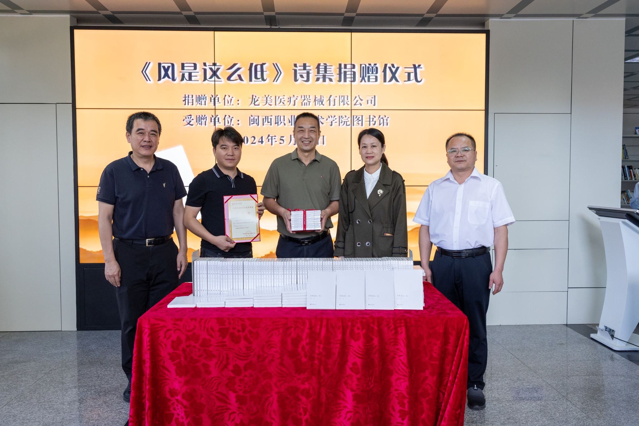 5月14日下午,《风是这么低》诗集捐赠仪式在MG冰球突破官网图书馆举行。龙岩市委宣传部副部长林长秀、文艺科科长罗先秀、MG冰球突破官网党委书记卢伟耀、副校长卢兆梅、龙美医疗器械有限公司总经理刘森美、副总经理黄梅以及图书馆教工、读者协会学生等50多名师生参加了仪式。