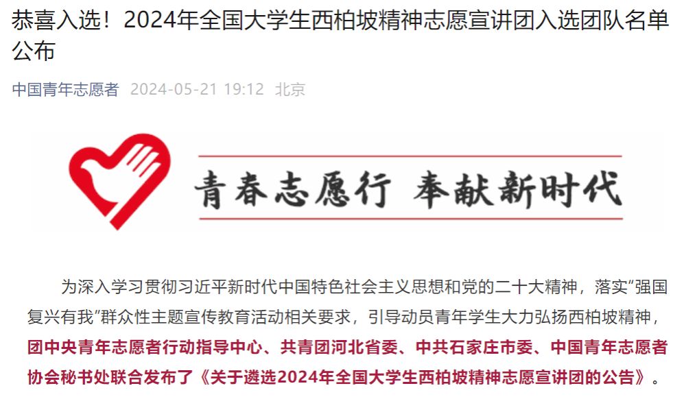 5月21日在团中央青年志愿者行动指导中心、共青团河北省委、中共石家庄市委、中国青年志愿者协会秘书处联合公布的2024年全国大学生西柏坡精神志愿宣讲团入选团队名单中,MG冰球信息工程学院刘剑友、王文烨老师组成的闽小信志愿服务队成功入选。