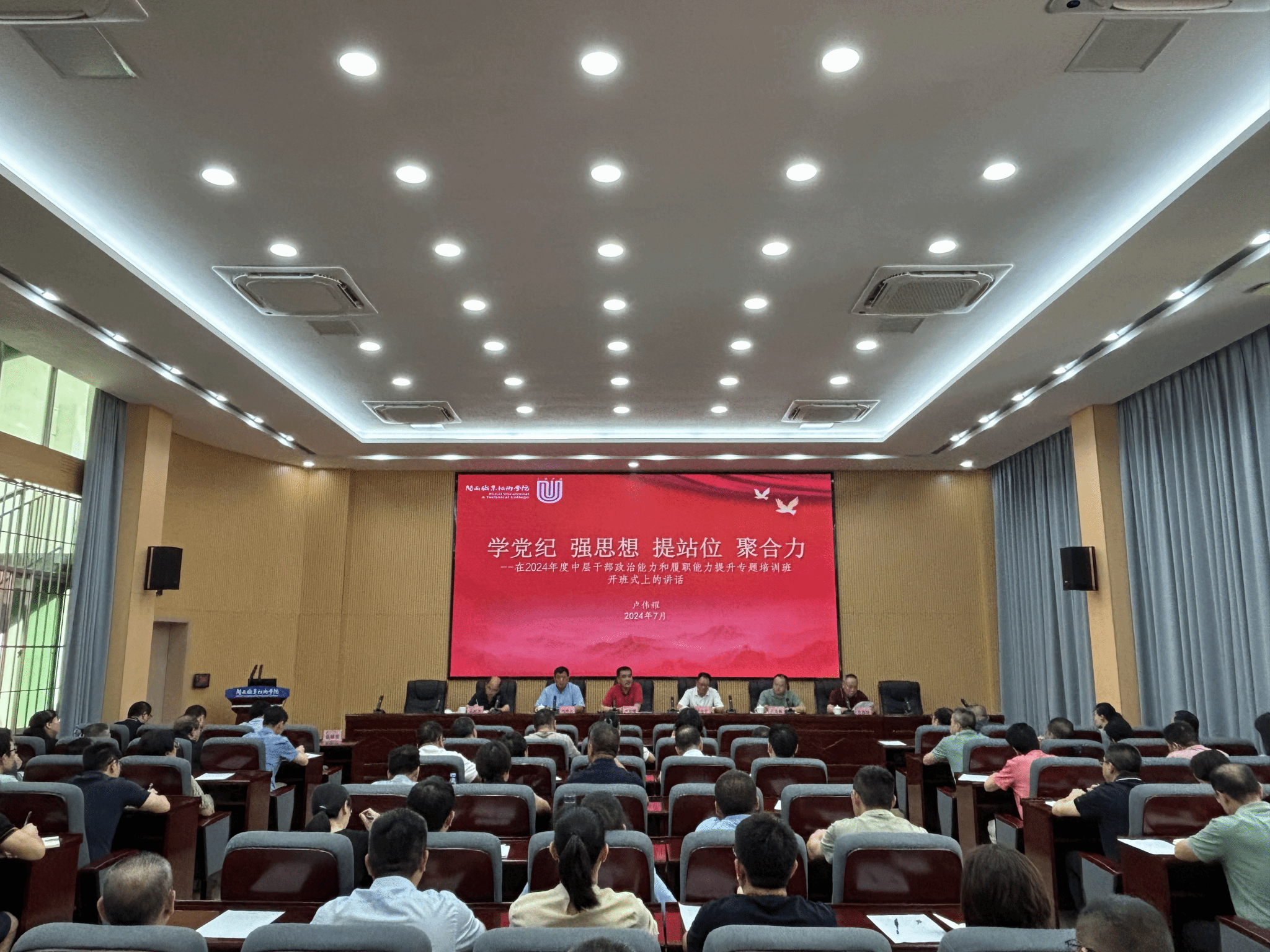 为深入学习贯彻习近平新时代中国特色社会主义思想,深刻领会习近平总书记关于党的建设的重要思想和关于全面从严治党推进自我革命重要论述,扎实推进党纪学习教育走深走实,教育引导学校中层干部学纪、知纪、明纪、守纪,进一步坚定理想信念,增强党性修养,提高履职能力,7月5日,中共MG冰球突破官网委员会2024年度中层干部政治能力和履职能力提升专题培训班开班。校党委书记卢伟耀主持会议,学校在家校领导、中层干部共80多人参加培训。