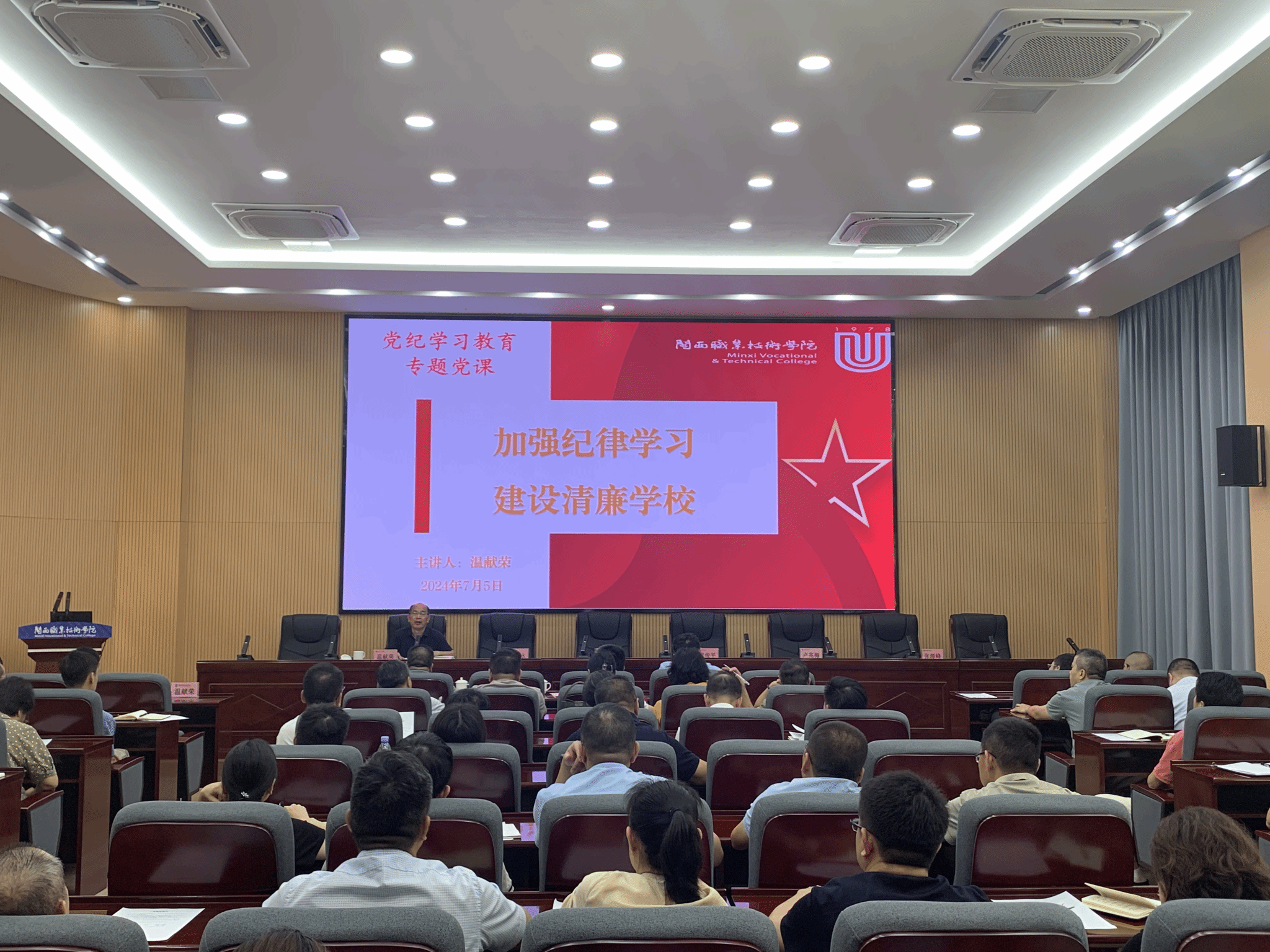 开班式结束后,学校纪委书记温献荣以《加强纪律学习 建设清廉学校》为题,为全体中层干部上党纪学习教育专题党课。报告会上,温献荣同志带领全体中层干部原原本本学,对加强纪律建设的重要性、《中国共产党纪律处分条例》的修订情况、主要特点和主要内容等进行深入讲解,并结合学校实际和高校工作常见问题,对学校当前以及今后如何抓好工作着力点、推进清廉学校建设进行系统分析,教育引导全体中层干部用党规党纪校正思想和行动,做好遵规守纪的“明白人”,廉洁从业从教的“老实人”,享受清廉的“平常人”,共同营造想干事、能干事、干成事的校园良好政治生态。