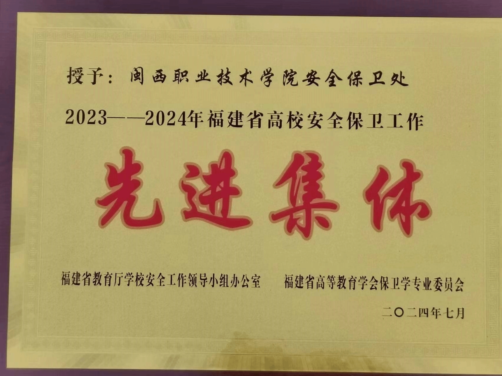 近日,从省教育厅学校安全领导小组办公室获悉,MG冰球安全保卫处被授予2023-2024年福建省高校安全保卫工作“先进集体”。