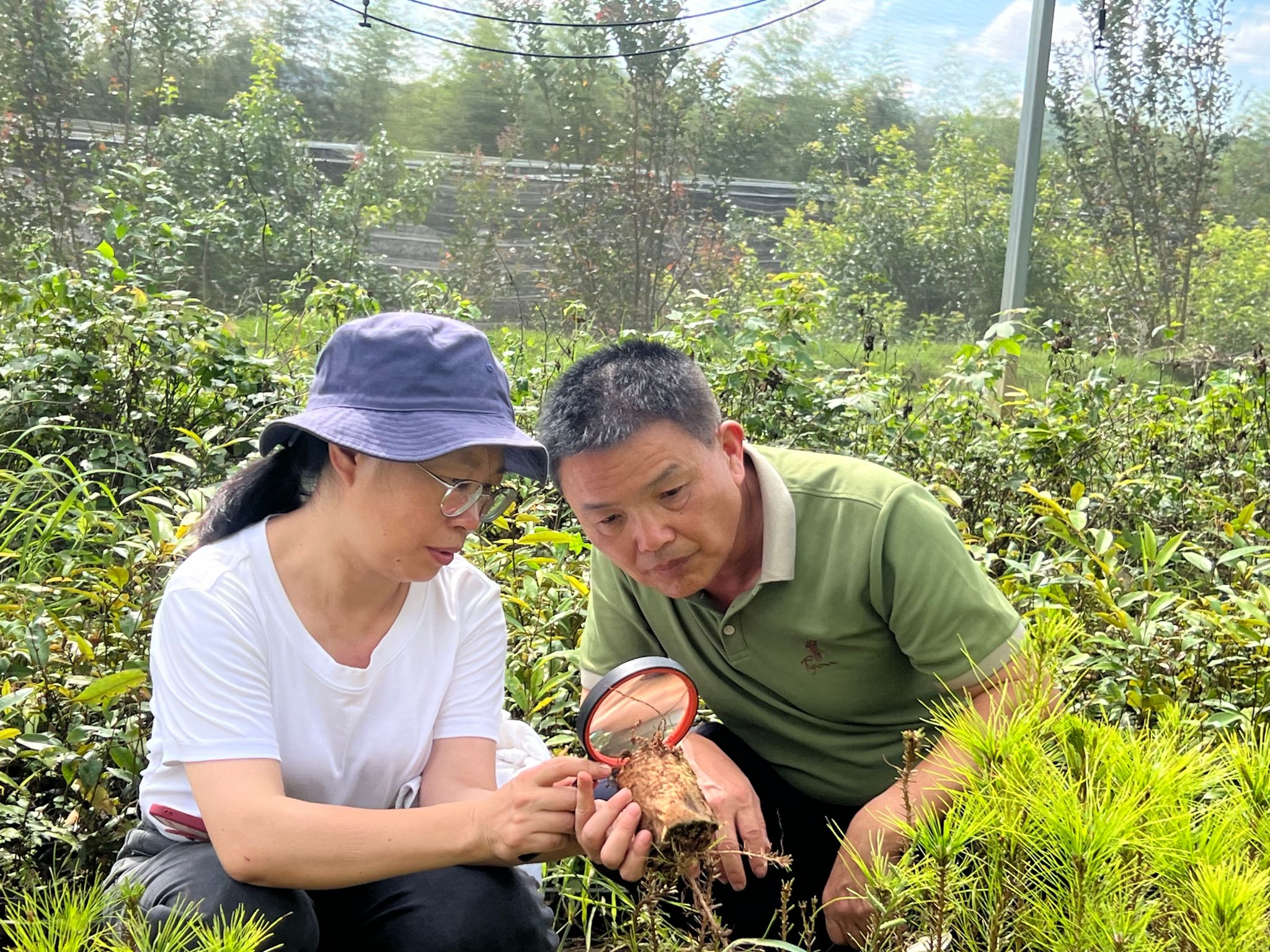 教师团队查看林场杉木林下经济药用植物骨碎补、金毛狗蕨、鸡血藤、重楼、土人参、多花黄精、黄花远志、麦冬等药用植物的长势情况,分析了林下的光照、温度、湿度、土壤等环境条件,并对药用植物的种植密度,肥料的施用、栽培管理等做了指导。在苗圃地,查看了太空育种的杉木苗、药用蕨类植物骨碎补、金毛狗蕨、米老排、闽楠等苗木的长势和病虫害情况,针对杉木苗的根腐病、叶部害虫、骨碎补的叶斑病、米老排的叶斑病等病虫害发生的原因进行了分析,并对林场人员进行了苗木栽培管理和苗木不同病虫害的预防和防治的指导,真正实现技术到田,服务到人,切实解决了林场急需解决的技术问题。