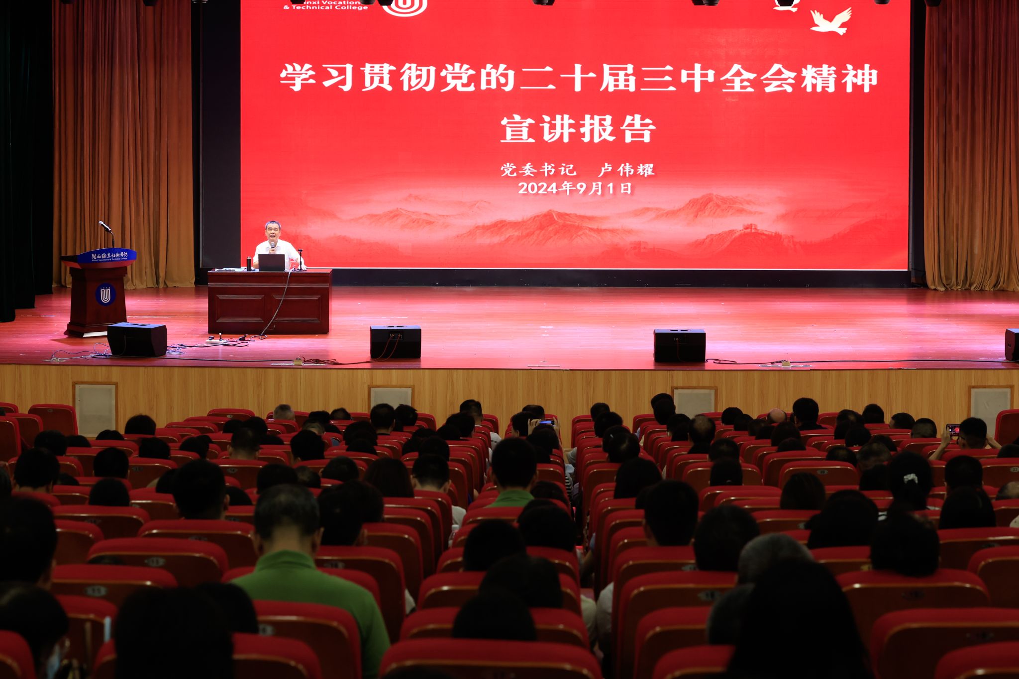 开学式的最后一项议程,由校党委卢伟耀书记为全体教职工作“学习贯彻党的二十届三中全会精神”宣讲报告。报告从党的二十届三中全会的重要意义、主要内容、结合学校实际贯彻落实全会进一步深化改革的举措等三个方面进行了全面的阐述。卢伟耀要求,推进学校进一步全面深化改革离不开全体教职员工的共同努力,我们要紧密团结在以习近平同志为核心的党中央周围,紧紧围绕全会确定的目标任务,立足学校实际,解放思想、更新观念、敢闯敢试、先行先试,共同推动革命老区农业农村现代化建设,建成闽西职教高地,推动全会精神落地生根、开花结果。