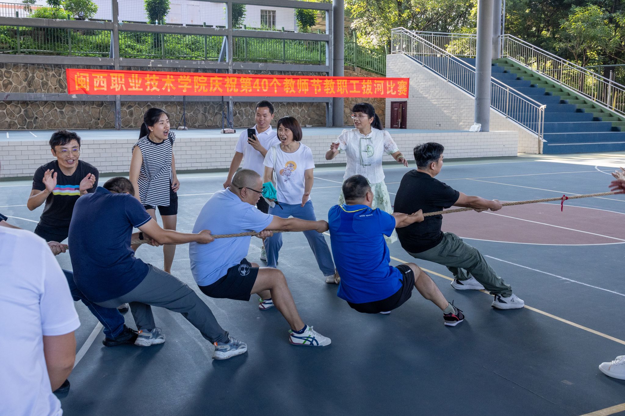 为隆重庆祝第40个教师节,大力弘扬教育家精神,加快建设教育强国,营造全校教职工同心协力,努力拼搏的工作氛围,丰富教职工的业余文化生活,增强教职工的身体素质,9月10日,学校工会在槟龙球场举行了庆祝教师节教职工拔河比赛,校领导亲临现场指导和参加了比赛。