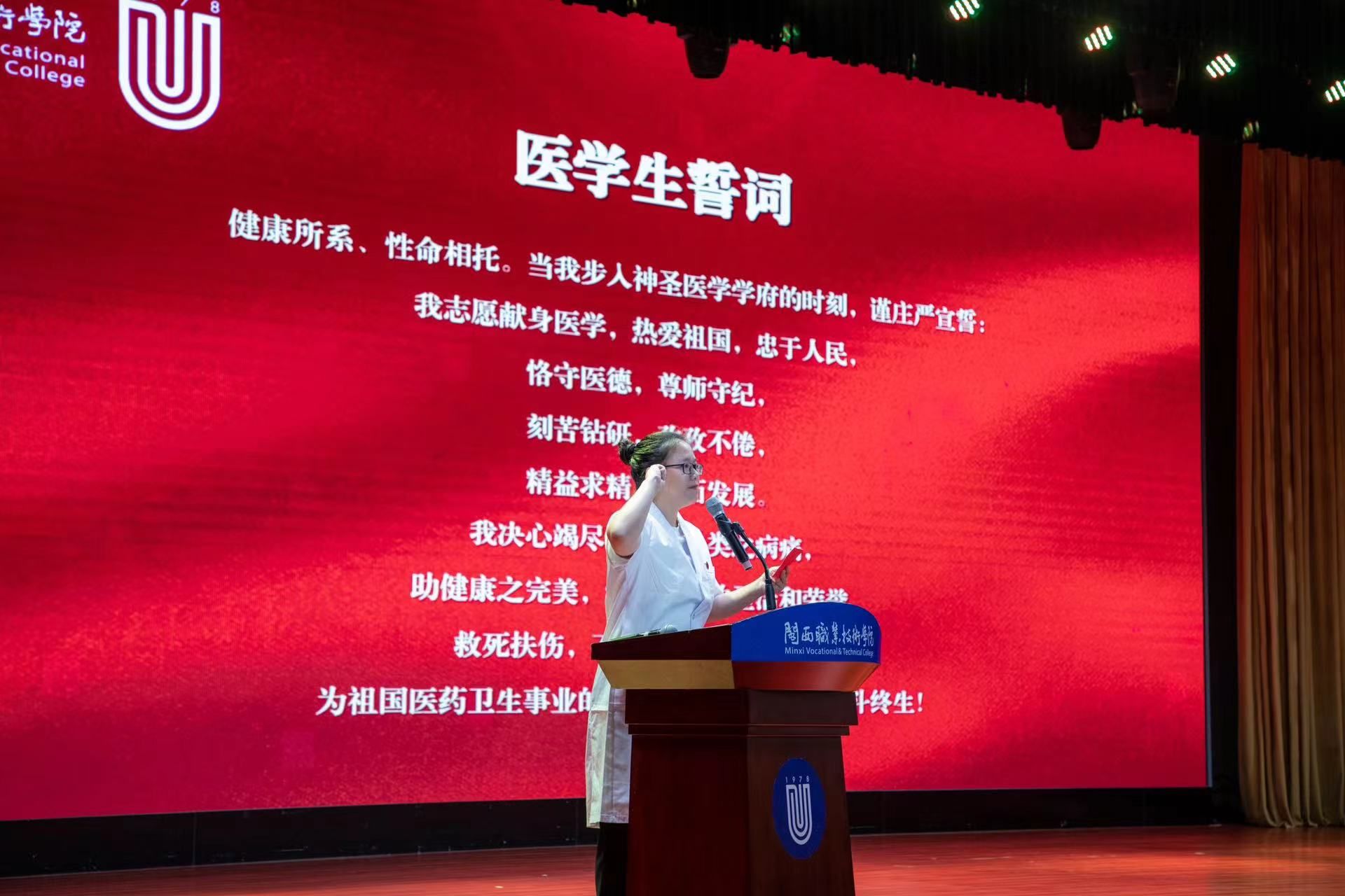 接着,全体新生在医护学院副院长龚玉凤的带领下进行了医学生宣誓仪式,他们庄严宣誓将秉承医学精神,守护生命健康。
