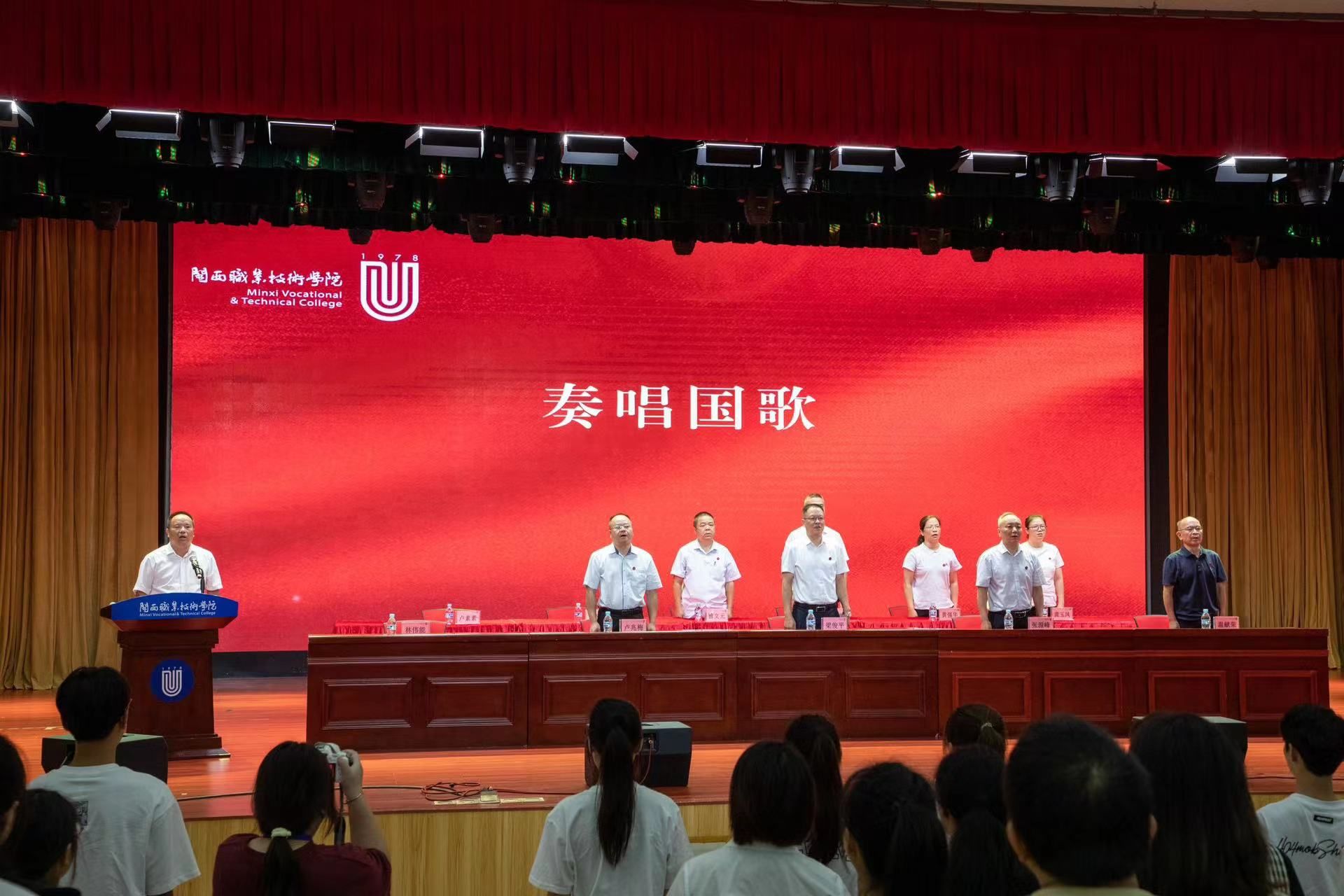 开学典礼第一阶段由校党委副书记林伟能主持。在雄壮的国歌声中,典礼拉开序幕,全体人员肃立,表达了对祖国的崇高敬意。