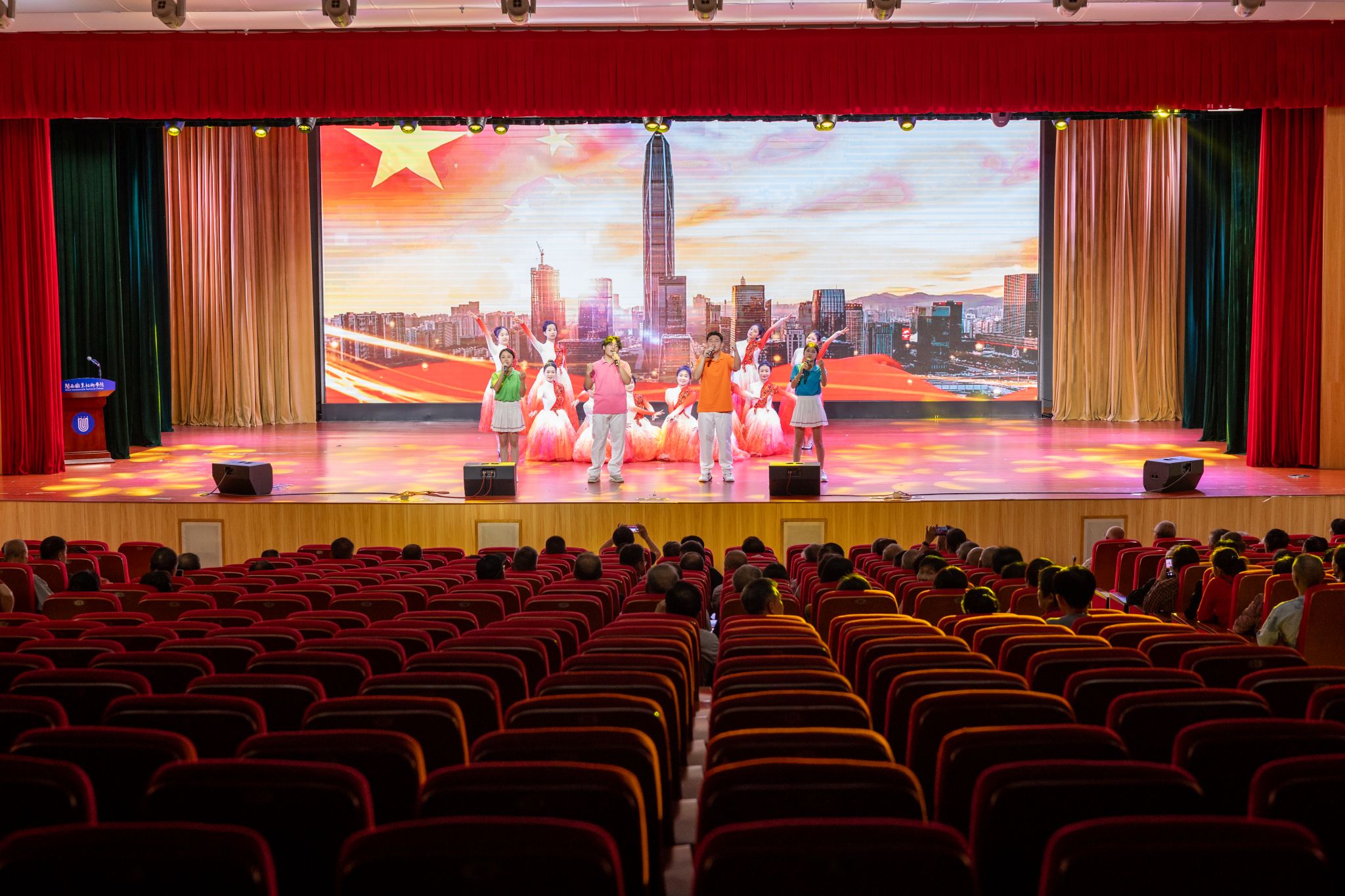 会场节日气氛高涨,离退休老同志们老有所学、老有所乐,老体协舞蹈队表演了舞蹈《万泉河水》,学生舞蹈队表演了歌伴舞《我爱你中国》,老少同台,精彩纷呈。