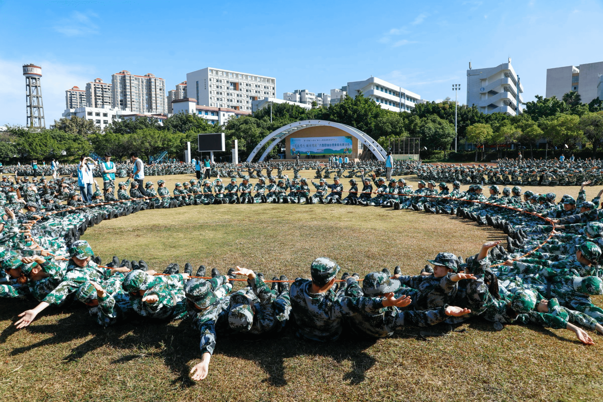 拓展训练活动由王金玉老师担任总教练,军训教官、大学生心理健康教育任课教师、社团学生干部、益心志愿者等担任助教,3400余名学生以班级为团队单位参与活动。活动分为异掌同声、数字口令、爱国三问、团队口号大比拼、团队节拍、团队动力圈、团队惺惺相惜几个环节。在“爱国三问”环节中,青年学生的爱国热情瞬间点燃,一声声掷地有声的回答引发同学们思考:“青年学生怎么做,可以让祖国越来越好?可以让集体越来越好?”;在“团队口号大比拼”环节中,各团队气势如虹、直冲云霄的口号展现了学生们初生牛犊不怕虎的精神面貌;在“团队节拍”环节中,各班学生围成同心圆,在一声比一声高的声音浪潮中,同学们真切地感受了强烈的凝聚力,展现了闽院学子的协作之美;在“团队动力圈”环节中,各班级借助动力绳在开阔的操场排成42个圆满的圆圈,像盛开的42朵灿烂青春之花,使大家充分感受到了团体协作的力量、振奋人心的活力。随着活动流转,活动的主题得到了层层深化和有效升华,在气势如虹、激情满怀中结束。