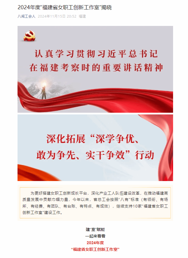 据悉,“福建省女职工创新工作室”是省总工会为更好搭建女职工创新成长平台,深化产业工人队伍建设改革,在推动福建高质量发展中贡献巾帼力量,按照“八有”标准(有领衔、有场所、有经费、有团队、有台账、有特点、有成效)进行考核评选,2024年有10家“福建省女职工创新工作室”获得支持。