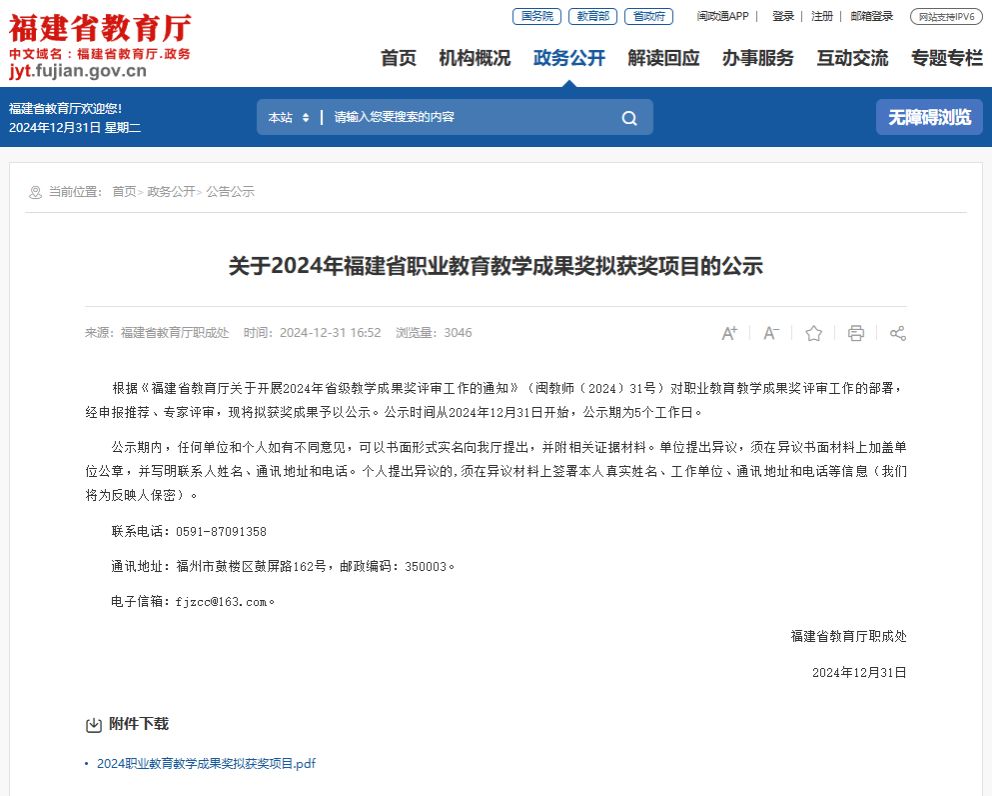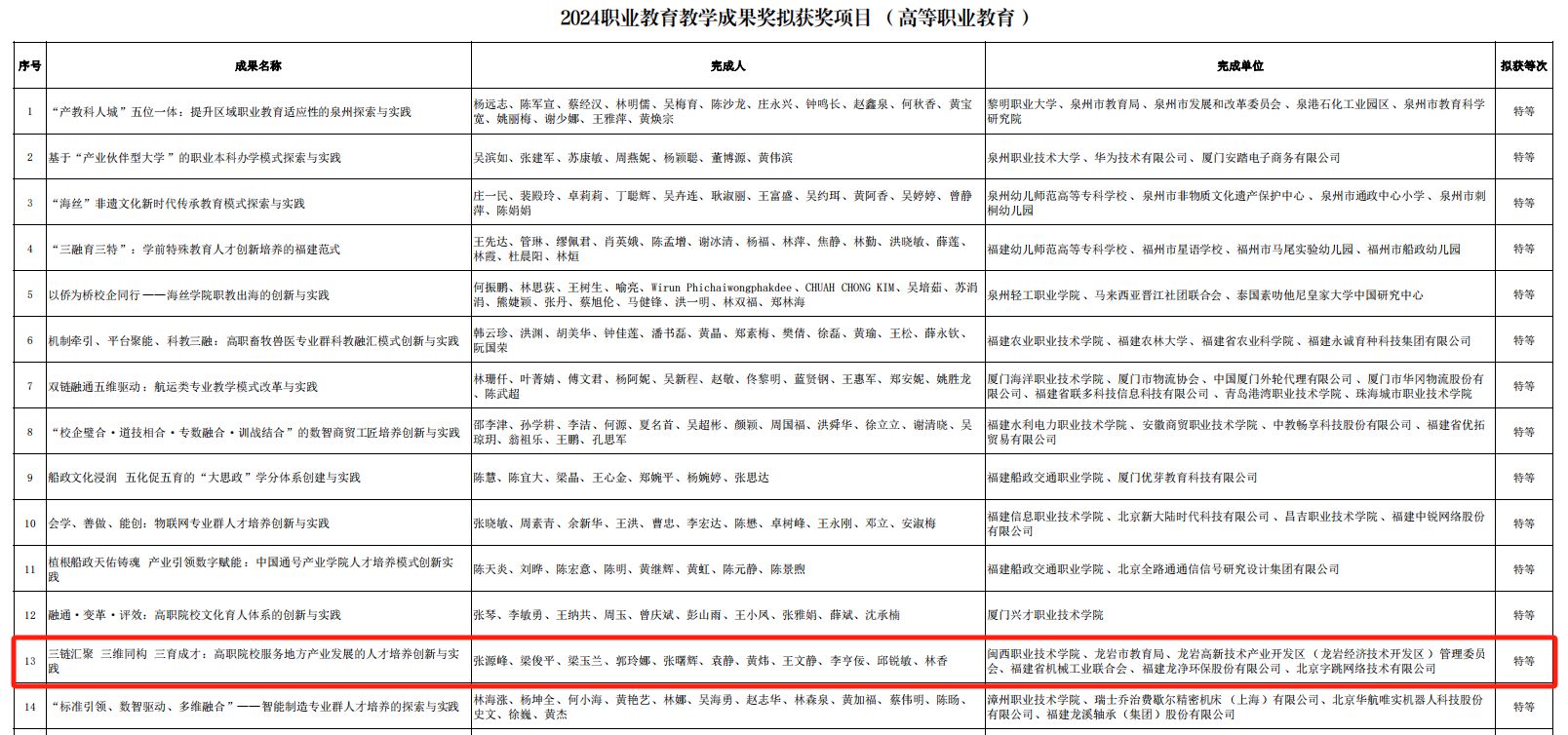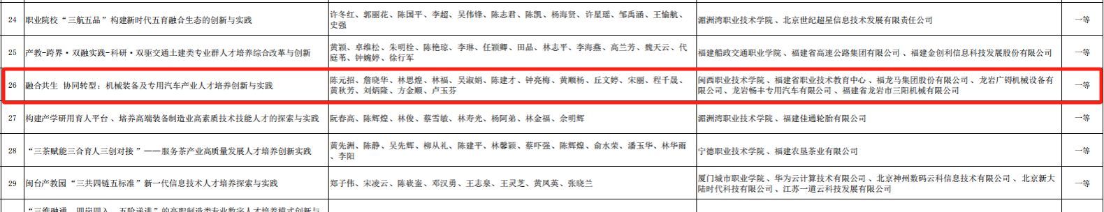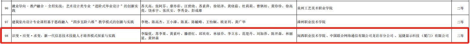 12月31日,福建省教育厅发布了《关于2024年福建省职业教育教学成果奖拟获奖项目的公示》,MG冰球取得重大突破,共有三个项目获奖。其中《三链汇聚 三维同构 三育成才:高职院校服务地方产业发展的人才培养创新与实践》获得特等奖;《融合共生 协同转型:机械装备及专用汽车产业人才培养创新与实践》获得一等奖;《识变·应变·求变:新一代信息技术技能人才培养模式的探索与实践》获得二等奖。