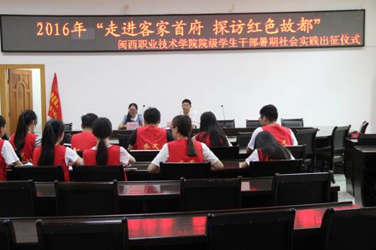 7月11日上午,我院在办公楼二楼会议室举行学生干部实践团队“走进客家首府·探访红色故都”暑期社会实践出征仪式。副院长吴新业、院团委负责人、学生组织负责人及学生代表参加。