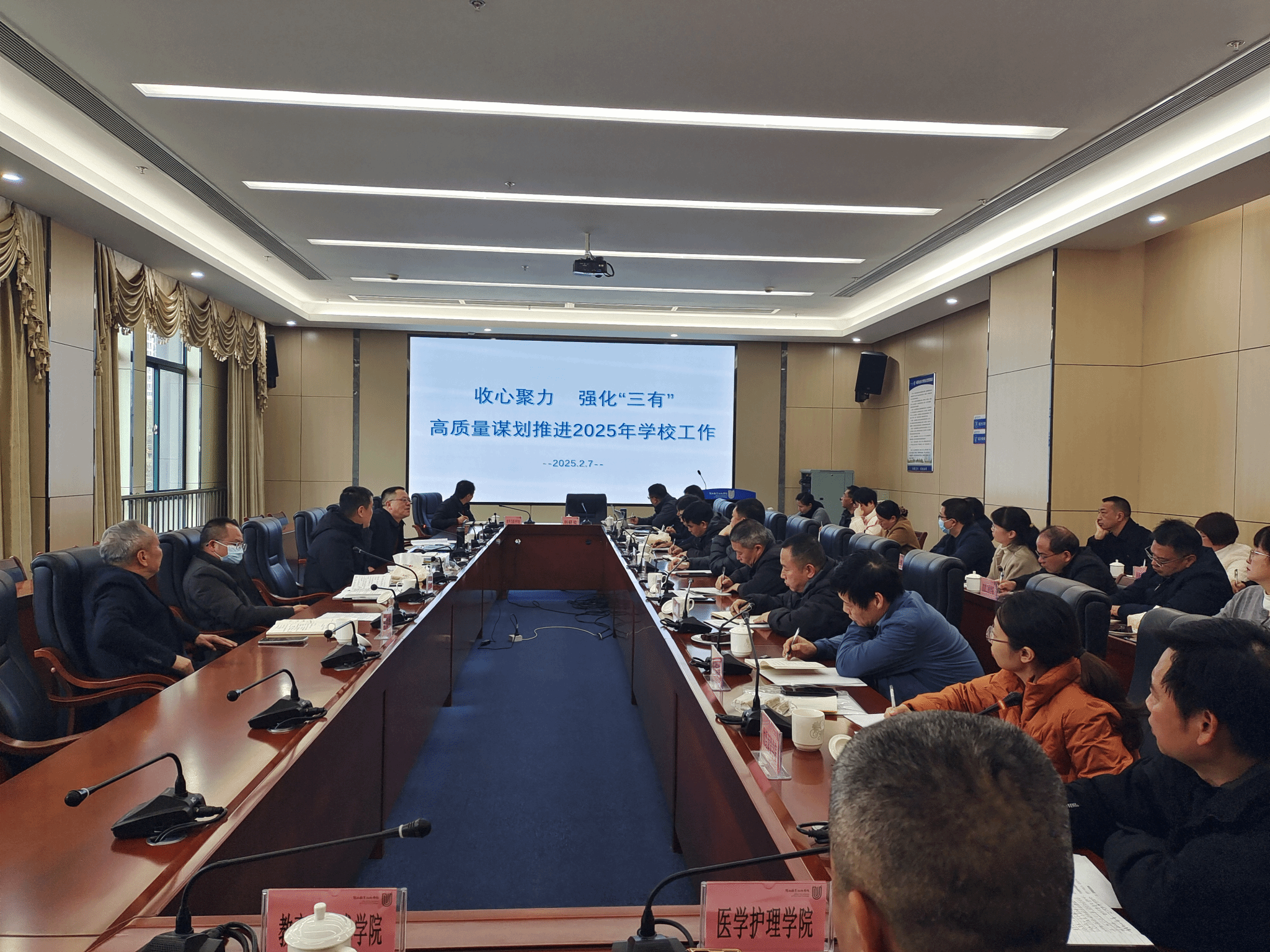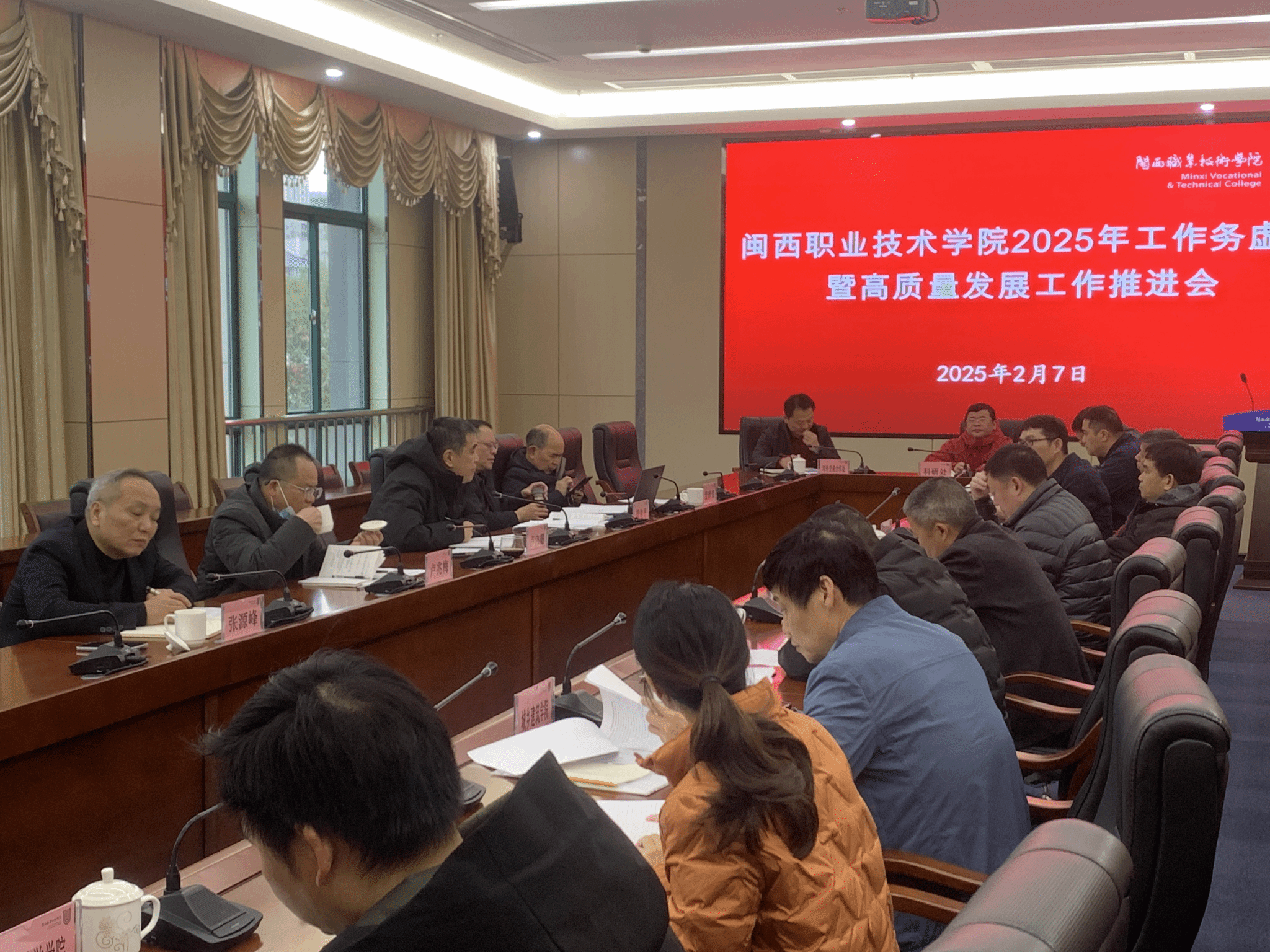 2月7日上午,MG冰球在岩声楼二楼会议室召开工作务虚会暨高质量发展工作推进会,进一步贯彻落实省、市深化拓展“深学争优、敢为争先、实干争效”行动总结部署会暨重大项目推进会精神,动员全校上下迅速收心归位、开局冲刺,以争优争先争效的行动自觉全力打好打赢2025年重点项目攻坚战役,推动新学期学校事业高质量发展。全体在校领导,各部门、单位主要负责人参加会议,会议由校党委书记卢伟耀主持。