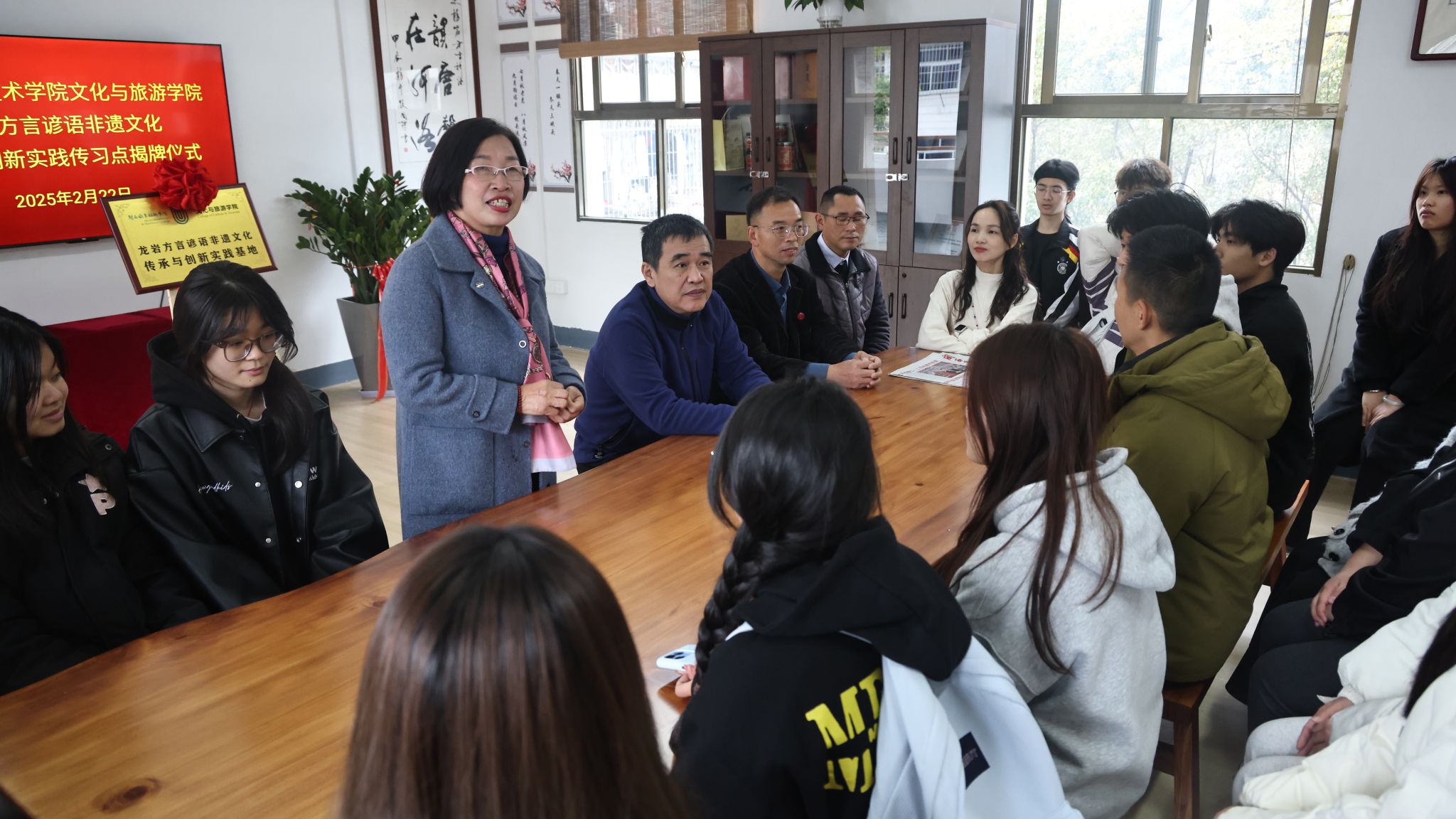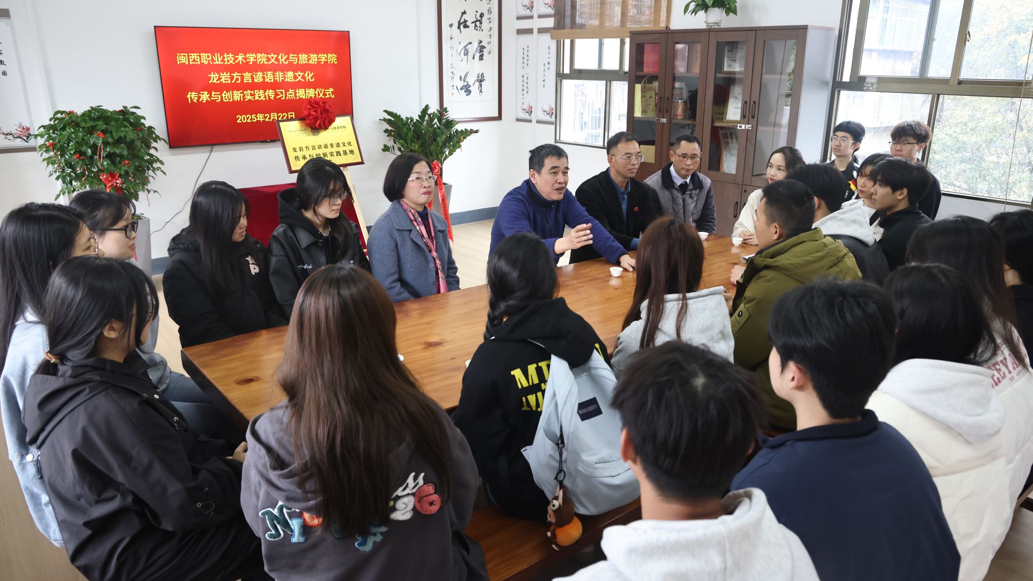 校党委书记卢伟耀在致辞中指出,龙岩方言谚语是闽西文化的“活态史诗”,是龙岩人爱国爱乡精神的凝练表达。守护方言谚语就是守护闽西人的精神原乡和文化基因。文旅学院将以实践基地为起点,通过“产教融合”“数字赋能”“育人铸魂”三大举措,推动非遗传承与创新。他呼吁社会各界共同参与,深化“校政企”合作机制,争创省级非遗传承示范基地,让龙岩方言谚语在新时代焕发出新的生机。