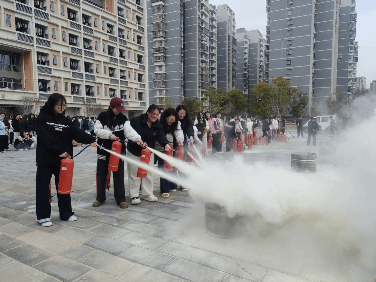 随后,进行现场消防灭火操作示范,在场的师生一一进行了灭火操练。