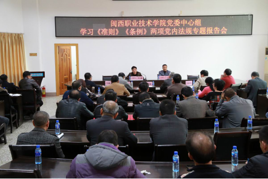 12月28日下午,院党委理论学习中心组举行学习《准则》《条例》两项党内法规专题报告会。党委书记马春延,院长来永宝,院领导吴新业、刘路永、卢兆梅、李贞鑫,院长助理李伟闽,全体中层干部参加报告会。