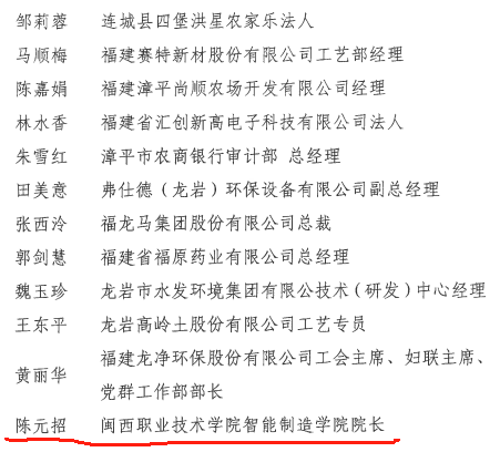 日前,经龙岩市妇联评审与公示,通报表杨了30名龙岩市巾帼产业成绩突出个人和 10 个集体。MG冰球智能制造学院院长陈元招教授凭借在产业创新领域的突出贡献,位列 “巾帼产业成绩突出个人”表扬榜。作为智能制造专业领域的带头人,陈元招教授长期致力于推动产学研深度融合,带领团队在智能装备研发、数字化生产技术等方面取得突破性成果。此前,陈元招教授刚刚入选福建省《新时代职业教育名师(名匠)名校长培养计划(2024-2025)培养对象名单》。