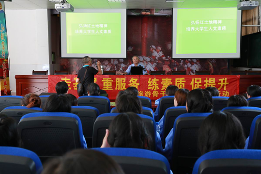活动中,院长来永宝教授以“弘扬红土地精神,培养大学生人文素质”为题作专题辅导报告。他从“红土地精神与人文素质”“红土地精神不会过时”“学生人文素质缺失原因分析”“弘扬红土地精神坚持用社会主义核心价值体系教育学生”“一个中国梦,两个不能否定,三个讲清楚,五个不搞,七个要讲好”“扬弃儒家文化的核心价值观念,了解中华文化的价值和光辉”“如何做好弘扬红土地精神,培养大学生人文素质实现中国梦?”等七个方面进行讲解,内容丰富、思想深刻,具有很强的指导性、针对性,对引导大家弘扬红土地精神,践行社会主义核心价值观具有很好的帮助作用。