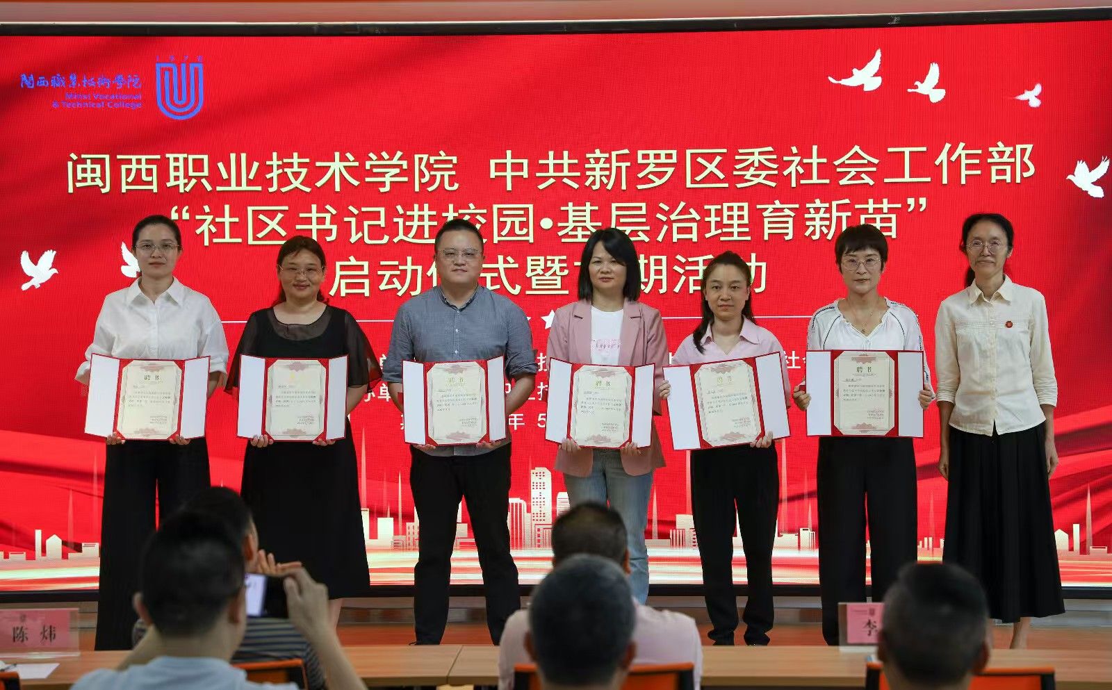 启动仪式上,卢兆梅副校长首先代表学校致辞,强调基层治理是国家治理的基石,并提出“校社双向赋能”的创新理念,鼓励社会工作专业师生通过系列活动将理论知识与社区实践深度融合,打造“实践教学+案例反哺”的双循环体系,为推动基层治理现代化贡献力量。随后,新罗区委社会工作部黄在丰副部长对系列活动进行简要介绍,并表达对社工学子投身基层治理事业的殷切希望。他指出,学校、社区应当携手并肩,在学生心中播撒服务基层、服务人民的种子,使学生在未来基层治理的广阔天地中有所作为。最后,举行聘任仪式,为6名“特聘讲师”颁发聘书。