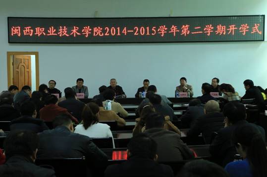 3月7日下午,MG冰球突破官网2014-2015学年第二学期开学式在办公楼二楼会议室举行。党委书记马春延,院长来永宝,副院长吴新业、刘路永、卢兆梅,院长助理李伟闽,全体中层干部,骨干校重点建设专业主任等近90人参加。