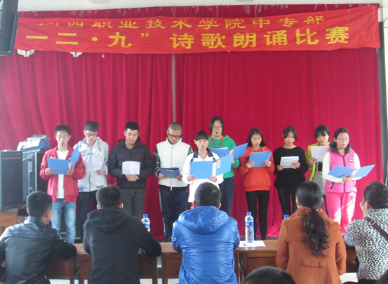 12月9日下午,中专部在北校区音乐教室举行了以“激扬青春,放飞理想”为主题的诗歌朗诵暨国学经典诵读比赛。