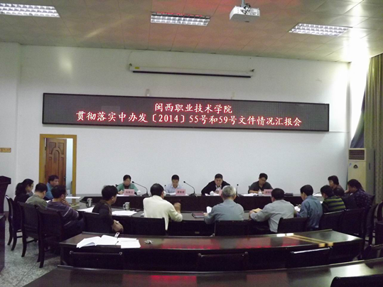 11月25日下午,市委教育工委正处级专职副书记马希一行4人莅临我院进行贯彻落实中办发〔2014〕55号和59号文件情况调研督查。我院在办公楼二楼会议室召开工作汇报会。在家院领导来永宝、吴新业、卢兆梅、李贞鑫,院长助理李伟闽出席。党工部、纪检监察室、学生工作处、团委、思政部等有关职能部门及部分系部有关负责同志参加会议。
