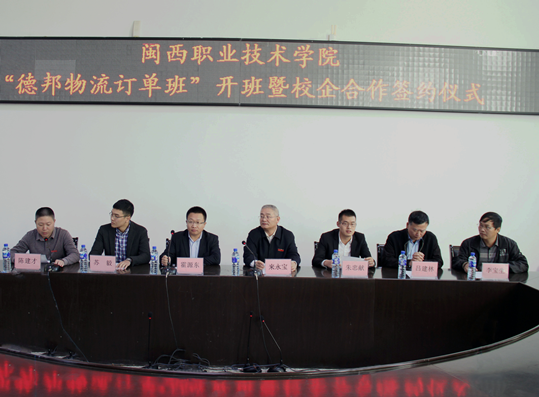 11月19日上午,我院2015届“德邦物流订单班”开班暨校企合作签约仪式在办公楼二楼会议室举行。院长来永宝教授,教务处、校企合作处、管理系党政负责人以及德邦物流厦门大区总经理霍源东、福建人事部高级经理朱忠献、龙岩区域经理苏毅、德邦物流工程部和培训部门负责人及管理系物流专业教师等出席。