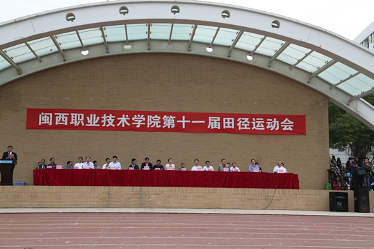 学院院长来永宝教授宣布第十一届田径运动会开幕。副院长吴新业致开幕词。他首先代表学校和大会组委会,向莅临大会的领导、来宾表示热烈的欢迎,向全体运动员、裁判员表示亲切的问候,向精心筹备本届运动会的全体工作人员表示衷心的感谢。他指出,加强体育工作,增强学生体质,对于提高学生综合素质,实现教育现代化,培养生产服务管理一线高级技术技能人才具有重要意义。他提出四点希望:希望在今后三天的比赛中,全体运动员发扬“团结、友爱、奋进”的体育道德风尚,弘扬“更快、更高、更强”的奥林匹克精神,尊重裁判,尊重对手,赛出风格,赛出水平,取得比赛成绩和精神文明双丰收;希望全体裁判员公平公正,尽心尽职,认真做好裁判工作;希望全体师生做文明观众,遵从大会纪律,为运动员鼓劲喝彩;希望大会组委会各职能组、全体工作人员精心组织、通力合作,热情服务,把本届运动会办成节俭务实、文明和谐、精彩圆满的校园体育盛会。裁判员代表、运动员代表分别宣誓。
