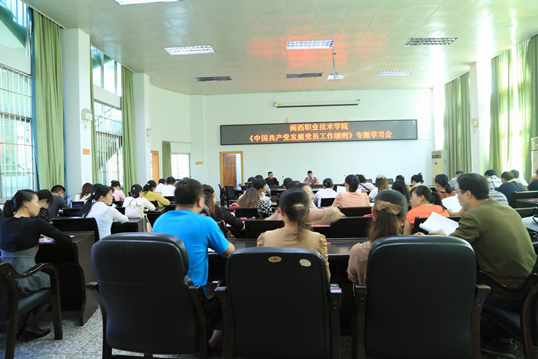 10月17日下午,我院在办公楼二楼会议室举行《中国共产党发展党员工作细则》专题学习会。《中国共产党发展党员工作细则》体现了党的十八大、十八届三中全会和习近平总书记系列重要讲话精神,体现了党要管党、全面从严治党的方针,强调了发展党员工作要认真贯彻控制总量、优化结构、提高质量、发挥作用的总要求。