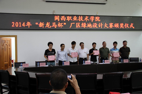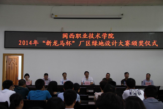 9月22日上午,我院在办公楼二楼举行“新龙马杯”厂区绿地设计大赛颁奖仪式。副院长吴新业、福建新龙马汽车股份有限公司副总经理陈晨辉出席了颁奖仪式,并为获奖学生颁奖。公司人力资源部部长徐德华、部门经理朱元莉,我院教务处、环境艺术系负责人,指导教师和2014级园林、环境艺术设计专业全体新生参加颁奖仪式。仪式由校企合作处负责人陈建才主持。此次大赛由福建新龙马汽车股份有限公司与我院环境艺术系联合举办。