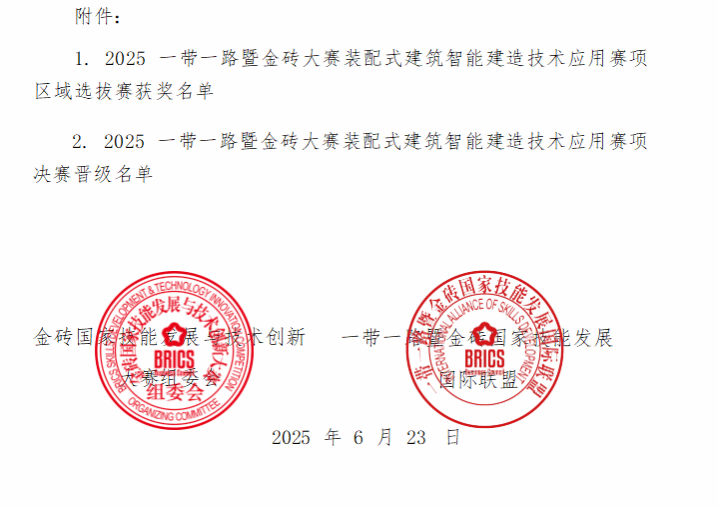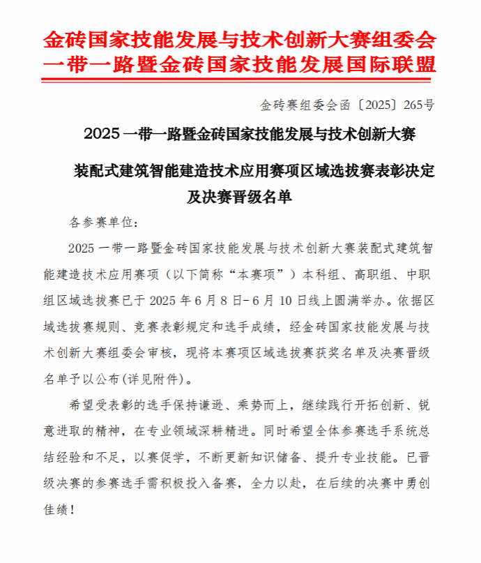 据金砖国家技能发展与技术创新大赛组委会、一带一路暨金砖国家技能发展国际联盟公布的区域选拔赛表彰决定及决赛晋级名单,MG冰球选派的装配式建筑智能建造技术应用赛项两支代表队,在高职组321支参赛队伍的激烈竞争中,分别以第一、第二名的成绩双获一等奖,成功晋级国赛。