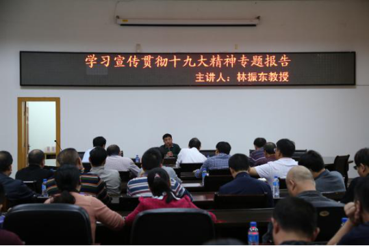11月7日下午,MG冰球在办公楼二楼会议室召开学习宣传贯彻十九大精神专题报告会,思想政治理论课教研部主任林振东教授作《迈进新时代 开启新征程 谱写新篇章---学习领会党的十九大报告精神》专题报告。学校纪委书记李贞鑫主持报告会,在家副校长吴新业、刘路永,校长助理李伟闽及全体中层干部听取专题报告。