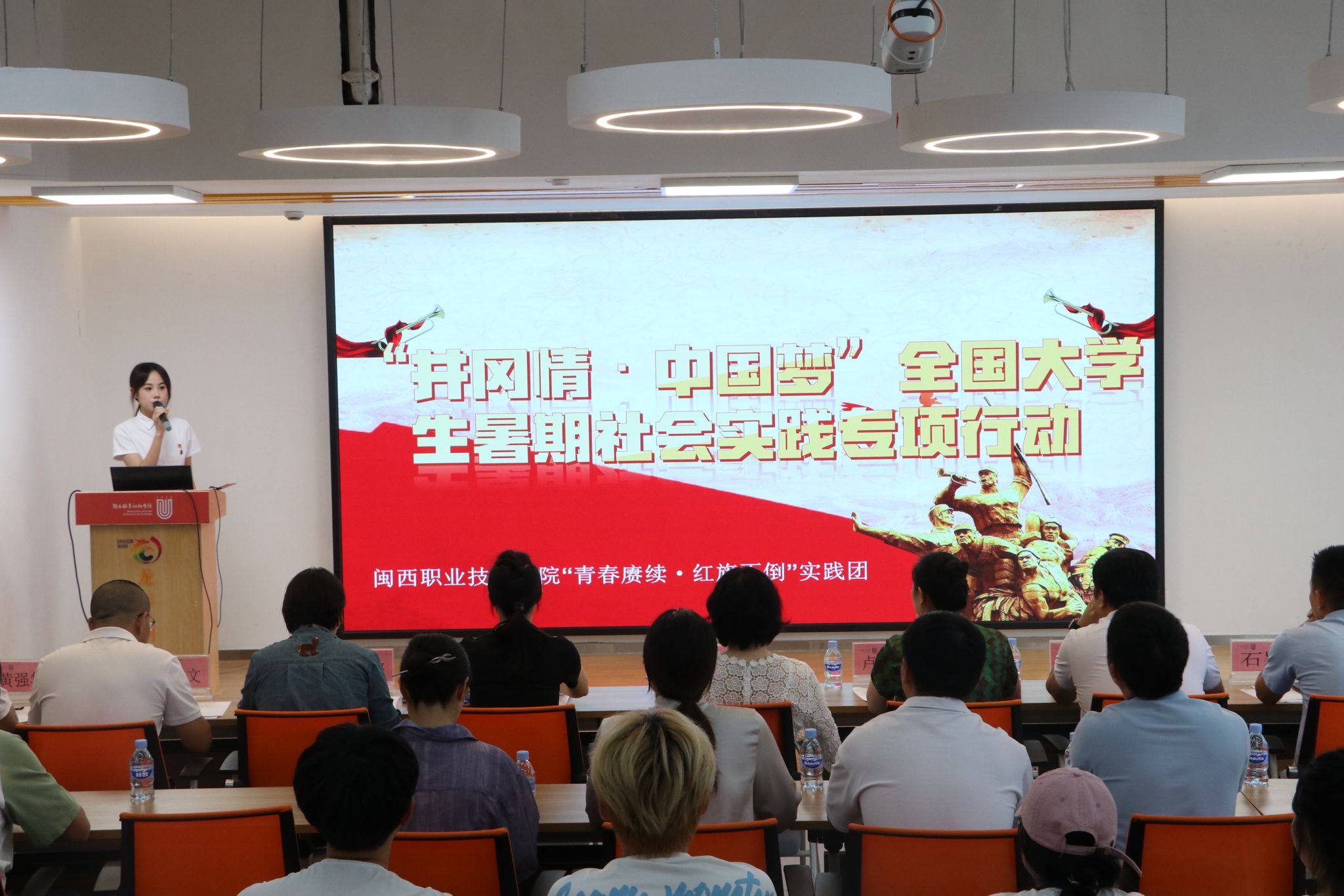 会议伊始,“青春赓续·红旗不倒”实践团率先分享他们赴井冈山参加“井冈情·中国梦”全国大学生暑期社会实践专项行动的宝贵经历与深刻感悟。随后,16支校级立项团队依次登台,围绕实践内容、特色亮点与实践成果进行精彩展示,生动诠释了闽大学子“知行合一”的青春风采。