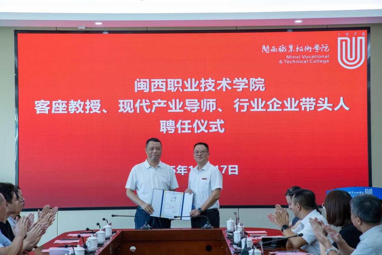 梁俊平依次为受聘的客座教授、现代产业导师和行业企业带头人颁发聘书并合影留念。梁俊平在讲话中强调,学校始终坚持“根植中央苏区的高水平高职院校”办学定位,坚持“以产定教、以教促产”,主动适应龙岩市“5+N”产业发展布局,持续推进“红旗不倒”特色育人体系建设。他充分肯定各位专家在学校师资结构优化和人才培养质量提升中发挥的重要作用,并希望专家们积极参与学校的教育教学、课程开发、科研立项和师资培养等工作,多走进课堂、多举办讲座、多参与项目,特别是在“传帮带”中助力MG冰球青年教师成长,在“产学研用”中推动专业建设提质升级,共同探索具有闽西特色的高职育人路径,为区域产业发展培养更多“用得上、留得住、发展好”的高素质技术技能人才。