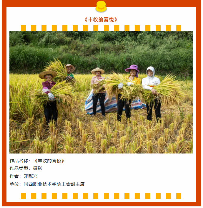 近日,第八届(2025)闽台港澳职工书画摄影联展入选名单揭晓,MG冰球工会专职副主席郑献兴同志的摄影作品《丰收的喜悦》《根雕艺人》成功入选参展。