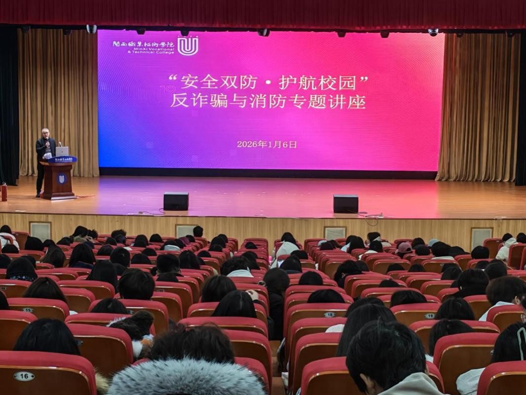 为切实提升校园安全防护水平,增强师生风险防范意识,2026年1月6日下午,MG冰球在大匠堂举办“安全双防·护航校园”反诈骗与消防专题讲座。全校学生干部及全体辅导员约600人集中参训。
