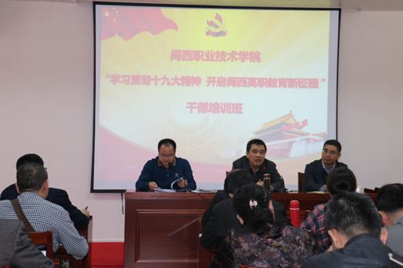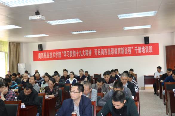 为深入学习贯彻习近平新时代中国特色社会主义思想和党的十九大精神,进一步加强干部队伍建设, 3月31日-4月1日,MG冰球在永定区委党校举办“学习贯彻十九大精神 开启闽西高职教育新征程”中层干部培训班,校领导及中层干部参加培训。