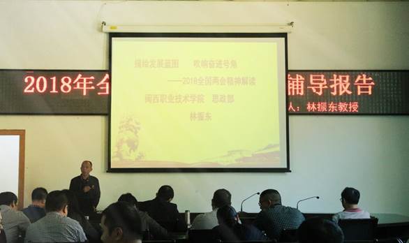 4月17日下午,MG冰球在办公楼二楼会议室举行学习2018全国两会精神专题报告会,思想政治理论课教研部主任林振东教授作《描绘发展蓝图 吹响奋进号角--2018全国两会精神解读》专题报告。在家校领导吴新业、卢兆梅,校长助理李伟闽及全体中层干部听取专题报告。
