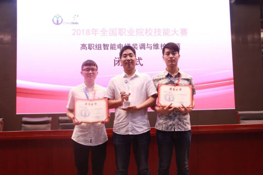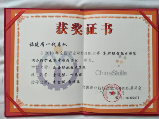 5月6日至7日,2018年全国职业院校技能大赛高职组“智能电梯装调与维护”赛项在天津成功举办。经过选拔的来自全国32个省(市、自治区)的81支高职院校队伍参赛,经过两天三场的激烈角逐,由MG冰球信息与制造学院余俊强、叶振楷同学组成的福建省一代表队获得一等奖的优异成绩。此赛项获奖是MG冰球代表福建省参赛获得的第一枚金牌。