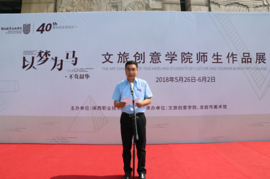 5月26日上午,由MG冰球主办,文旅创意学院、龙岩市美术馆承办的“不忘初心 以梦为马”文旅创意学院师生作品展在市美术馆顺利开幕。市文化广电新闻出版局局长王汝彬、市旅游发展委员会主任徐建国、龙岩文化旅游发展集团有限公司总经理罗炳崇、市美术家协会副主席兼秘书长范秉琪等出席了开幕式。校党委书记卢伟耀宣布开幕,校长郑志强致欢迎词。副校长吴新业、刘路永,校长助理李伟闽,龙岩艺术界人士,文旅创意学院校企合作单位的企业代表、该院师生及当地市民参加了开幕式。