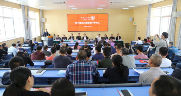 10月13日上午,MG冰球2018级二元制新生开学典礼在文科楼第一报告厅举行。校长郑志强、副校长吴新业, 市技术监督局技监科科长陈玮, 福建省特种设备检验研究院龙岩分院副院长王旭标、龙岩市电梯协会副会长温洪安、龙岩市水泥同业商会常务理事雷清华、福建龙麟集团副总经理黄永生,学校办公室、教务处、继续教育学院、信息与制造学院、环境工程系等相关负责人及相关教师,2018级二元制新生120人参加会议。教务处负责人主持会议。