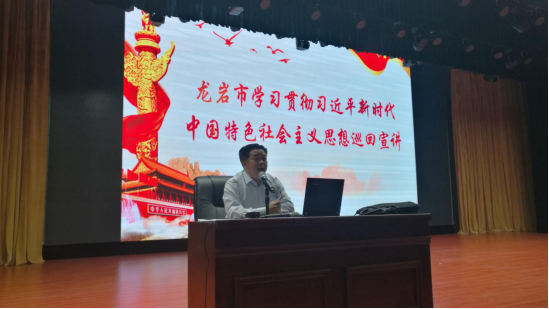 11月11日,龙岩市学习贯彻习近平新时代中国特色社会主义思想巡回宣讲在MG冰球“大匠堂”举行。龙岩市文广新局副局长、市文物局局长、MG冰球客座教授李史明作《坚定文化自信,保护好利用好红色文化和客家文化资源,推动闽西文化的繁荣兴盛》专题辅导报告。副校长刘路永主持报告会。MG冰球第三十二期入党积极分子、文旅创意学院学生等近800人聆听了报告。
