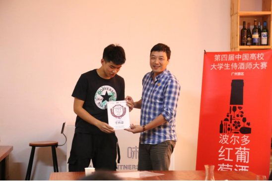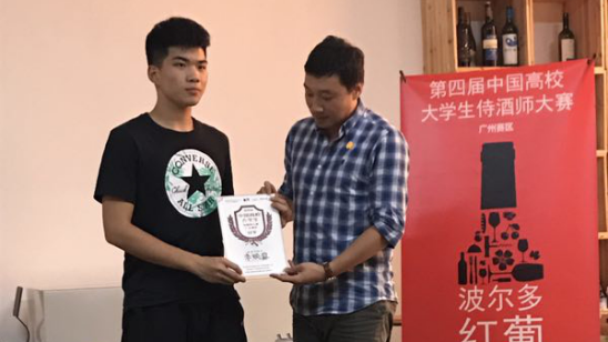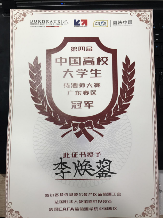 李焕鋆同学在葡萄酒开瓶、醒酒、品鉴、对客服务等几个环节的比拼中表现突出,最终以93.8分的最高分获得了第四届中国高校大学生侍酒师大赛广东赛区冠军,接下来将与广西赛区冠军,上海赛区冠军比拼,争取最后总决赛晋级名额。