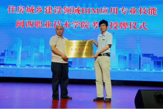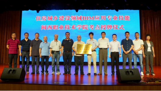 BIM考评管理中心主任余金华为MG冰球“住房城乡建设领域BIM应用专业技能培训考试报名考试点”授牌,城乡建筑学院李志文接牌。此次授牌标志着MG冰球BIM技术人才培养迈出了新的步伐,对学校建筑信息化人才的培养和应用技能水平的认证及产教学融合模式的推广,都具有深远的意义。至此,龙岩市高校首家BIM应用专业技能培训报名考试点落户MG冰球城乡建筑学院。