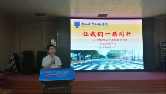 6月11日-15日,各院系积极开展毕业生离校教育活动。11日,文旅创意学院以“让我们一路同行”为主题,在卫培楼3D导游实训室开展2019届毕业生离校教育。该院班子成员、专业主任、辅导员和全体毕业生参加。