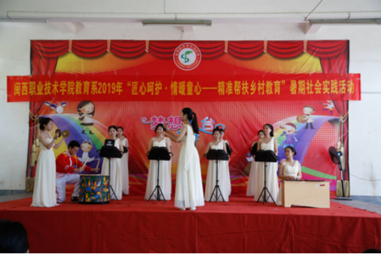7月1日,“匠心呵护 情暖童心”“三下乡”社会实践团队前往永定区峰市中心小学开启精准帮扶乡村教育志愿服务活动,新罗区20余位学生也参加了活动。活动包括美术、手工、啦啦操、声乐等艺术课程,新罗区学生与当地学生同上一堂课;课程结束后,城乡儿童分享参加本次活动的感受和心情,进行了手拉手交朋友的仪式并互换礼物;还为峰市中心小学六年级毕业典礼献上奥尔夫音乐表演、快板《王小齐》、女声表演唱《不完美女孩》、诗朗诵《诗意祖国》及啦啦操表演等精彩节目。