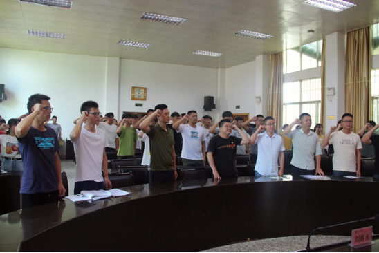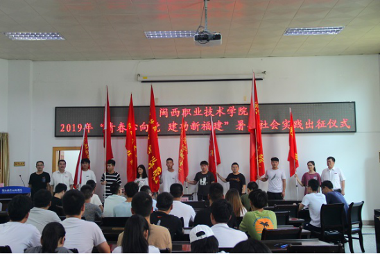 潘巧云同学代表所有参加社会实践的同学表态,吴开卷同学领誓全场“社会实践誓词”,卢伟耀和刘路永向各社会实践团队授旗。